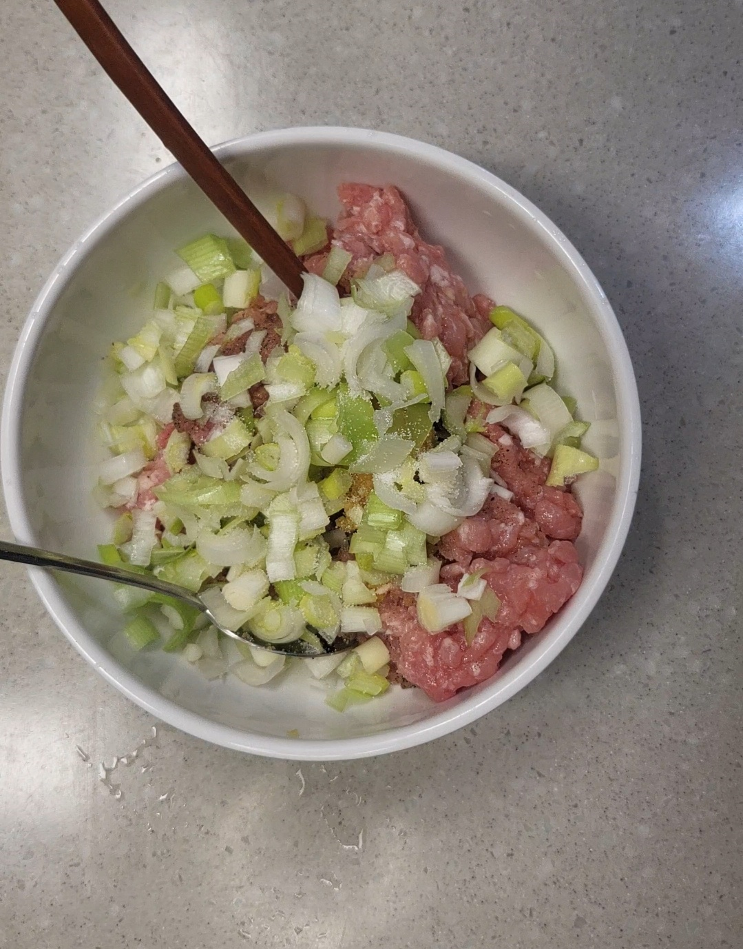 다진 돼지고기(또는 소고기)에 소금(1/4작은술) 후추 다진 마늘 다진 파 간장을 넣고 잘 섞어주세요.